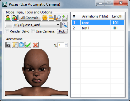 Pick Folder with Poses (*.bfp) / Pick Folder with Animations (*.bfa) Кнопка выбирает каталог с файлами поз/анимаций. После выбора каталога предлагается создать позу по умолчанию, т.е. позу с текущим положением контролов и, если в каталоге уже есть файлы поз/анимаций - они появляются в списке справа. Лучше хранить позы и анимации в одном каталоге, тогда при переключении режима список обновляется и не нужно будет указывать другой каталог. Все указанные каталоги автоматически запоминаются, потом их можно выбирать из выпадающего списка. |