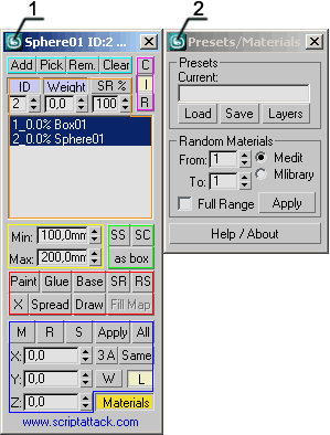 2 - second, additional window of the script for work with materials and presets. Shows up when button Materials is pressed.